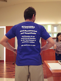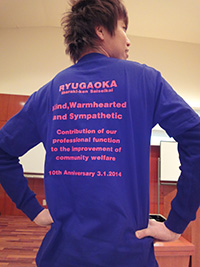 紺地にピンクと白文字で「龍ケ岡の理念」が英文でプリントされたもので職員の評判は上々で、後日全職員に2枚ずつプレゼントされました。