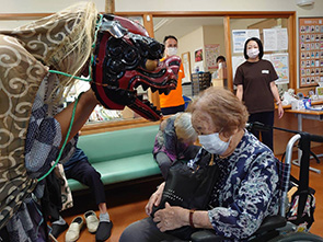| 玄関ロビーで | 獅子舞と記念写真 | |