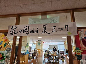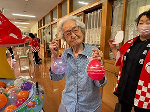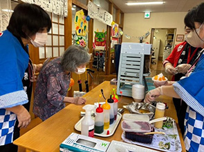デイサービス龍ヶ岡では、8月9日にミニ夏祭りを開催しました。毎年恒例行事として実施していますが、今年は3つの出し物を準備しました。輪投げやヨーヨー釣りでは皆さま真剣にチャレンジしていました。かき氷の注文では好きな味を好きなだけ選び美味しそうに食べていました。また今回、学生のボランティアさんの参加もあり一緒に楽しい夏の一日を過ごされました。