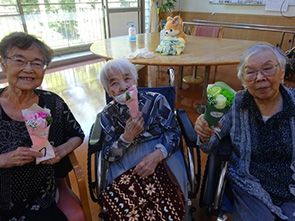 敬老の創作レクリエーションでは頭を使い、玉入れで身体を動かし、最後には花束のプレゼントと、盛りだくさんの一日となりました。