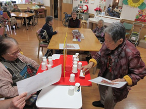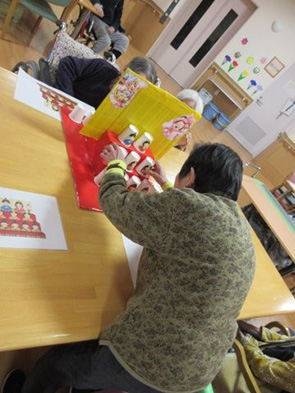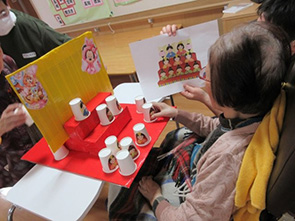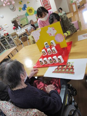 レクリエーションでは、「手作りひな壇並べゲーム」を行いました。ご利用者様には、印刷されたひな壇の見本を見ながら、手作りのひな壇に人形を並べていただきました。皆さん真剣な表情で取り組まれ、「ここかな?」「こっちがいいかな?」と楽しみながらひな壇を完成させていました。