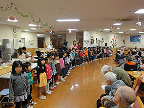 ④懐かしの唱歌や童謡、歌謡曲を披露した後、利用者の皆さんも一緒に唄った。