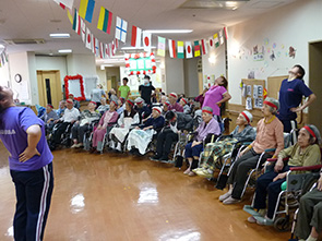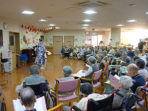 | ③ | 名前のとおり、笑うことは長寿の秘訣と楽しいトークに合せ、入所者様もみんな笑い誘われながら楽しい一時を過ごされました。 |