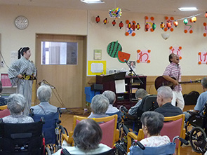 | ① | 平成27年8月22日(土)に、ご夫婦二人で活躍している市内在住のボランティア“笑屋(わらいや)”が訪問してくれました。 |