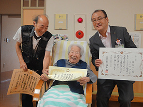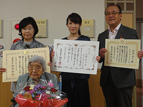 | ② | 今年は、龍ケ岡では3名の方が100歳となり、市長から表彰状と記念品が手渡されました。 ご家族も同席され、みんなで長寿を祝いました。 《100歳になられた方・・・大竹 正年様、大野 ゆき様、福島 はつ様〉 |