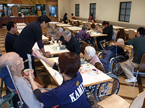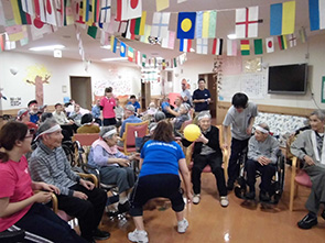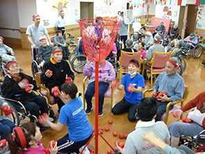 | ② | 入所者様とショートステイ利用者様合同による大運動会で、ユニット対抗による紅白玉入れやボール送りゲーム等、皆さん真剣に白熱した取り組みで心地よい汗を流していました。 |